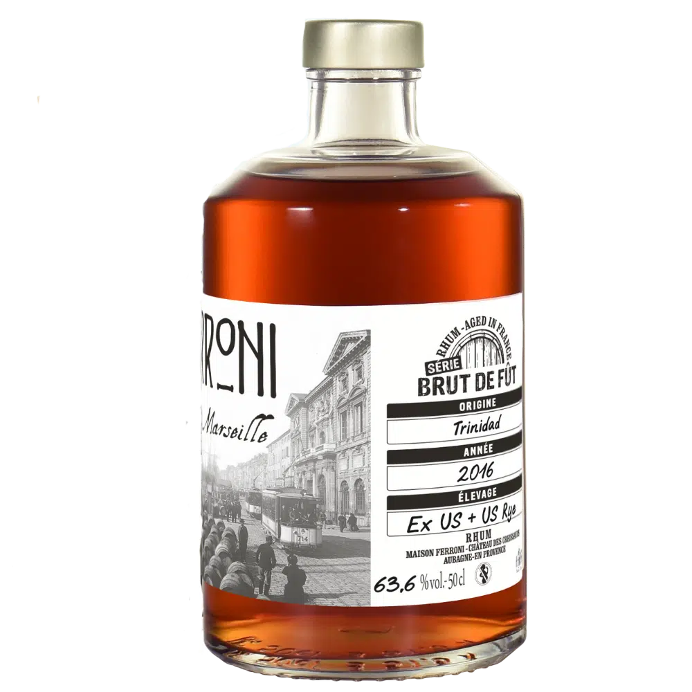 Le Ferroni Brut de Fût Trinidad 2016 est un rhum de mélasse vieilli pendant trois années en fût américain à Trinidad, suivi d’un deuxième élevage en Provence pendant quatre années en fût américain Ex-Rye whisky (Roof Rye produit par la Maison Ferroni).